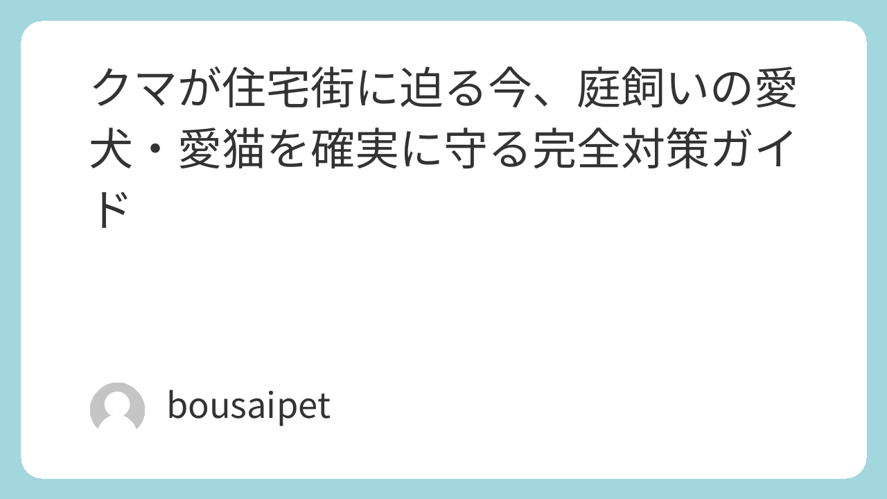 クマ出没はもはや「山の話」ではなく、住宅街に住む私たち全員に関係する問題です。しかし、餌の管理、外出時間の制限、訓練、グッズの準備、この4つを徹底すれば、ほぼすべてのリスクを回避できます。大切な家族である愛犬・愛猫を失ってから後悔しないよう、さっそく今日から準備を始めていってみましょう。