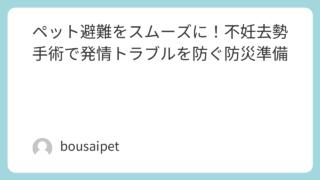 不妊去勢手術で発情トラブルを防ぐペット避難をスムーズに!不妊去勢手術で発情トラブルを防ぐ防災準備 この記事では、発情期が避難に与える具体的な影響、手術がもたらす避難へのメリット、手術と合わせて活用したいグッズなどについて詳しくお伝えしていきます。 2025.11.10不妊去勢手術で発情トラブルを防ぐ