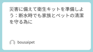 災害に備えた衛生キット準備ペットを災害時の虫被害から守る:事前の防虫対策と衛生グッズの選び方 この記事では、なぜ災害前に防虫対策が必要か、対策を怠った場合のリスク、家族とペットにおすすめの防虫グッズ、そして衛生管理の方法を詳しくご紹介していきます。 2025.10.19災害に備えた衛生キット準備