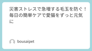災害ストレスで急増する毛玉を防ぐコツ災害ストレスで急増する毛玉を防ぐ!毎日の簡単ケアで愛猫をずっと元気に この記事では、毛玉ができるメカニズムからスタートし、日常ケアの利点や放置の危険性、具体的な予防法、災害時の備え、おすすめアイテムまでくわしく解説していきます。 2025.11.06災害ストレスで急増する毛玉を防ぐコツ