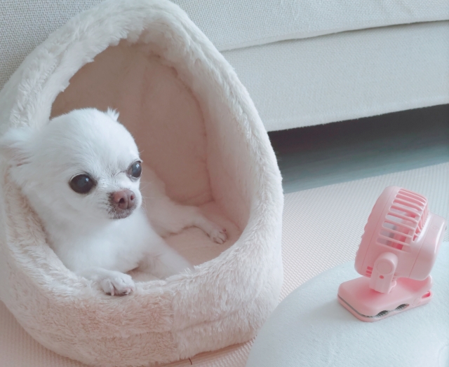 ペット用に、低温モードの電源を選び、冷却マットを接続します。鼻の短い犬は熱中症リスクが高いので、扇風機を常時動かしてあげましょう。