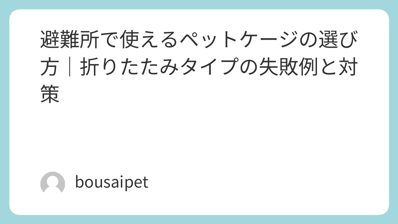 折りたたみケージは、防災時にペットを守るためにとても役立つ道具といえます。大切なのは、軽さ・使いやすさ・ペットが慣れやすいかどうかのバランスを考え、自分の避難スタイルに合ったものを選ぶことです。徒歩避難がメインなら軽量コンパクトなタイプを、車移動が可能な場合は固定機能付きを、長期滞在を想定するなら耐久性が高いタイプを中心に検討すると良いでしょう。どのケージを選ぶ場合も、日常の中で少しずつ慣らしておくことが大切です。防災用品としてだけでなく、普段も使いやすいものを選ぶと防災の準備を続けやすくなります。すべてを完璧に揃える必要はありません。自分とペットの状況に合わせて、少しずつ準備を進めていきましょう。また、ケージとあわせて準備しておきたい防災バッグの考え方は猫の防災バッグおすすめ比較|避難所生活を想定した選び方で確認できます。