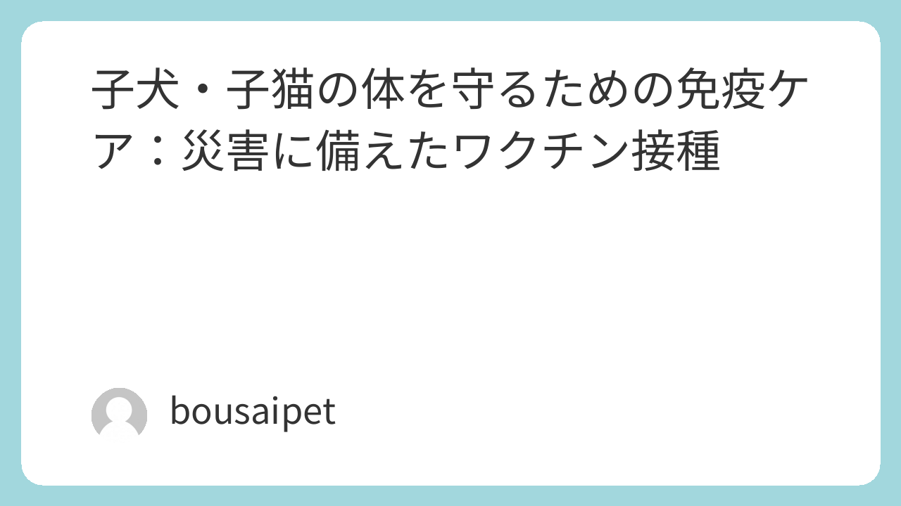 この記事では、なぜ災害前に子犬・子猫の免疫を高めておくべきなのか、準備を怠った場合の心配事、そして具体的なワクチン接種やケアの方法をご紹介していきます。