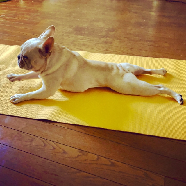自宅では、ヨガマット上で軽いストレッチをします。飼い主が優しく後ろ足を曲げ伸ばしするだけでも、可動域が広がっていきます。マッサージも効果的で、関節周囲を円を描くように揉むと血流が改善してきます。