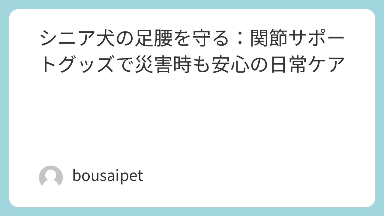 シニア犬の関節ケアは、毎日の簡単な習慣から始まり、災害時の大きな安心へとつながります。サプリで軟骨をしっかり補強し、クッションで体への負担をやわらげるシンプルな方法で、愛犬の元気を守ることができます。こうした日々の積み重ねが、避難時も愛犬が痛みなく移動でき、家族みんなで安全に避難所生活を送れる基盤となります。