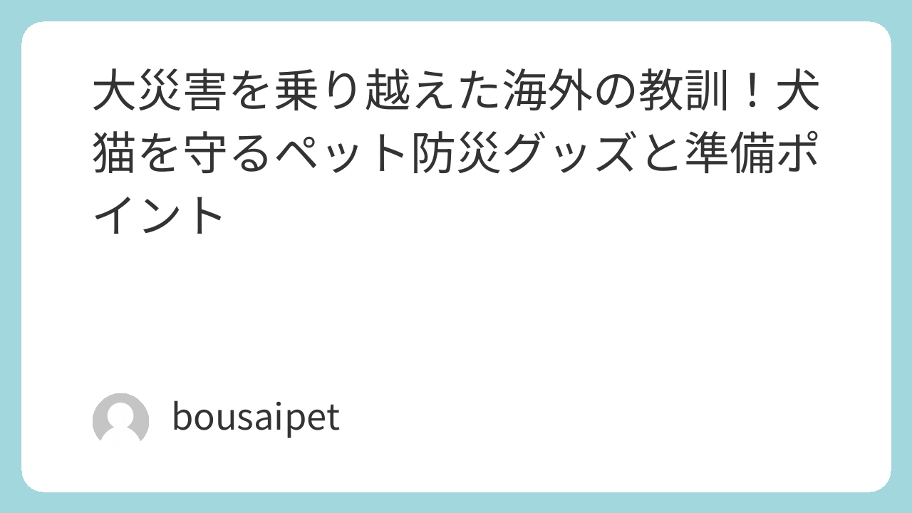 海外の取り組みの共通点は、ペットを家族と同じく大事にする考え方になります。日本は地震が急にくることが多いので、計画と持ち運びやすさが鍵になりますね。