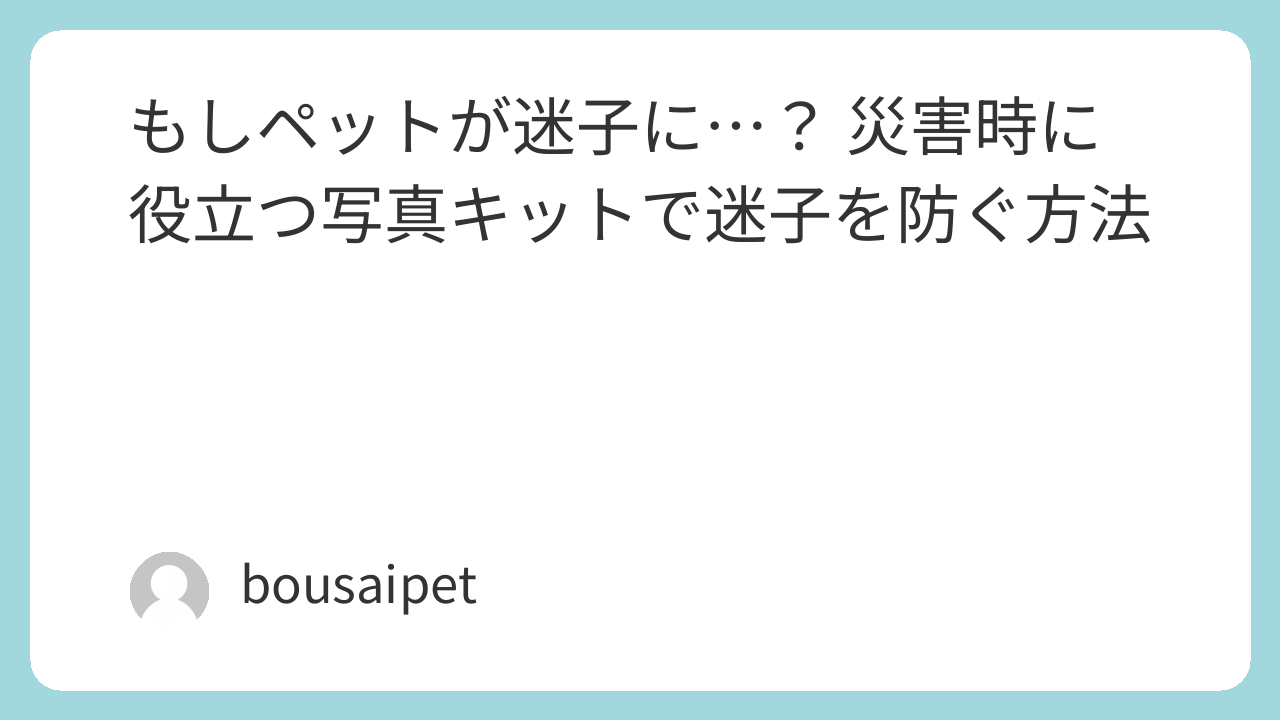 災害は突然やってきますが、ペットの写真キットを用意しておけば、迷子になっても再会の可能性がぐんと高まります。素早い捜索でペットの命を守れ、家族の心の安心にもつながります。食料や避難の準備と一緒に、写真キットを家族で作ってみましょう。この小さな一歩が、愛するペットとの未来を守ります。今日から、ペットの写真を撮って、準備を始めてみてくださいね。