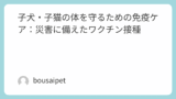 ジステンパー、狂犬病ワクチン済みであること。マイクロチップを装着する。防災バッグにフード5日分と消毒スプレーを入れておく。
