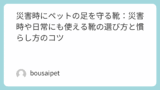 | 災害備蓄 | 食料3日分、水1人1日2L・ペット1日1L、簡易トイレ、防水バッグ、避難所リスト、マイクロチップ情報、連絡網。 |